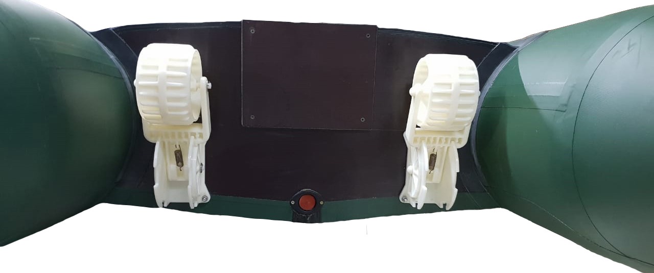 Все комплектующие (крепежные гайки, шайбы, болты, пружины и.т.д.) изготовлены из нержавеющей стали. Транцевые колеса на лодку имеют три положения. Продукт запатентован и произведен в России.