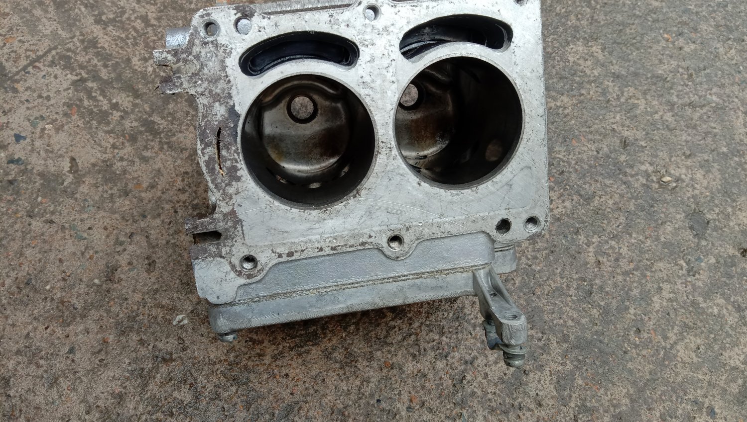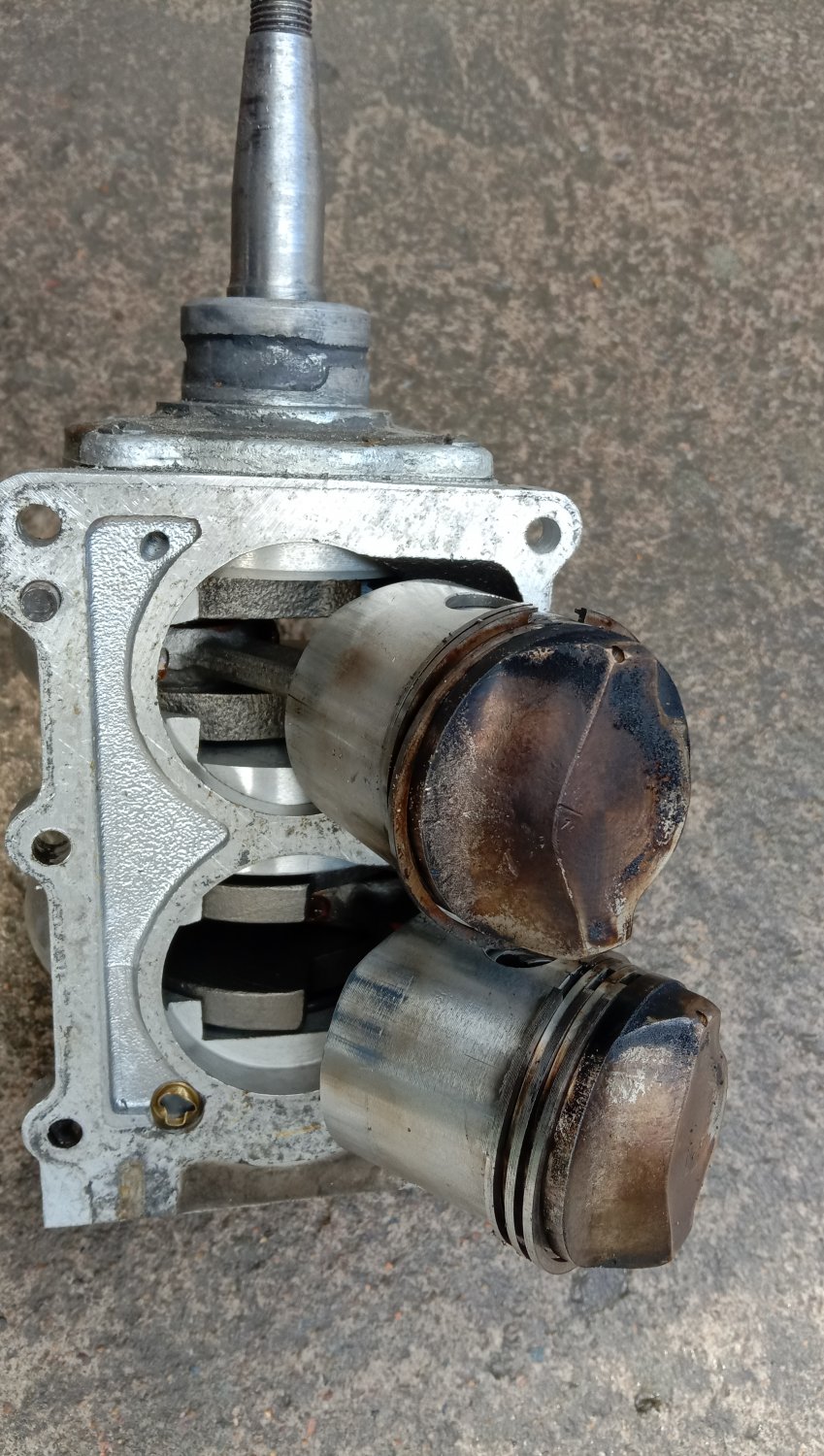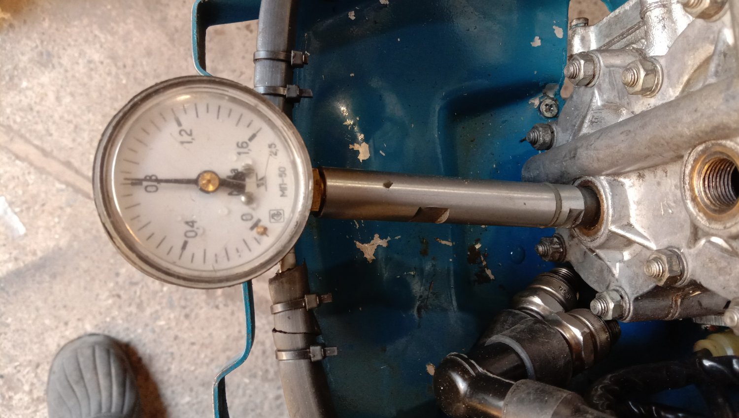 Собрал очередную "капсулу времени" Ветерок 8М, новая нога, новая голова. Голова была разграблена, т.е. ничего навесного не было. В сапоге только заменил верхний сальник, потому что разбирал для ревизии вала и помпы. Торсион можно было не полировать, сальник не менять. Мягкий, пружинка блестит. На зеркале и корпусе помпы вообще нет канавок от работы. Голову раскалывал только для осмотра и чтобы зачеканить стопоры колец на поршнях, ибо у этих моторов их выпадение не такая уж большая редкость. Показания компрессометра, те что больше - в гараже после сборки на холодную, вторые уже на горячую после того как поработал. Сначала поставил стоковые катушки зажигания, но одна поработав начала отказывать. Пришлось ставить от скутера.