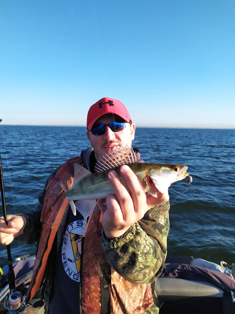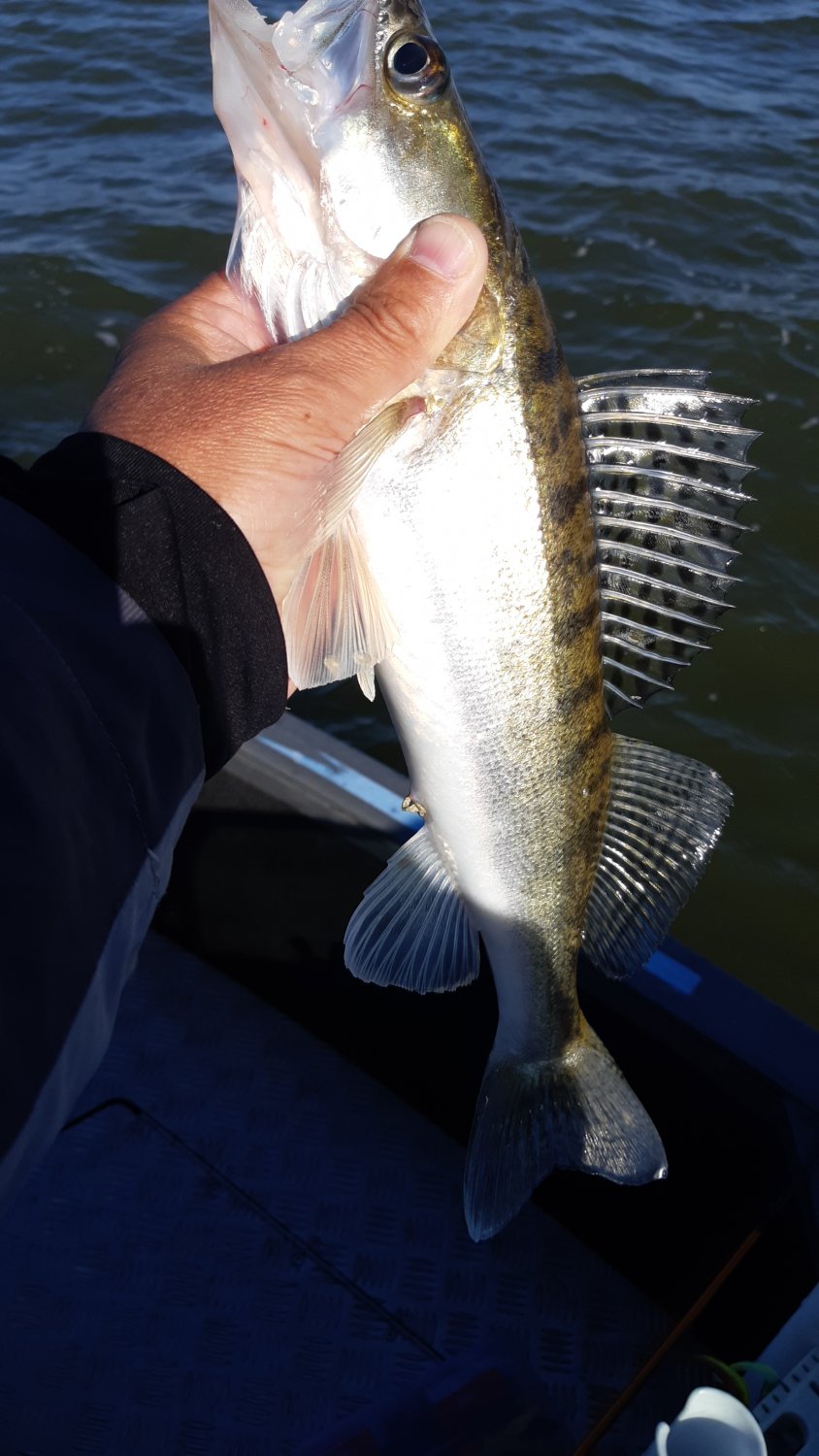Рыба была на всех точках, но отказывалась брать. За первые 5 часов в улове была только одна. Но "терпенье и труд...". Поиски были долгими и напряженными. Прошли километров 30. Тем больше эмоций принесла удача. "Только эхолот, ребята, только эхолот! Не благодарите". Судак под двушку - претензии к фотографу и росту начинающего спиннингиста. Это его первая рыбка на спиннинг