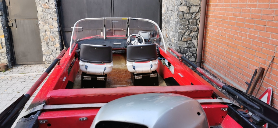4 стакана для спиннингов ,лобовое стекло с калиткой , транспортировочный тент (есть и ходовой с дугами ,снят по не надобности ) Мягкие сидения , передние вращающиеся с рундуками , что очень удобно при ловле. По электрике: всё новое ! ВСЁ ОЧЕНЬ КАЧЕСТВЕННО установлено, из хороших материалов , 2 новых аккумулятора 60А, (один для эхолота) могут работать как по отдельности, так и параллельно. Помпа откачки, прожектор , ходовые диодные огни , диодная подсветка кокпита ,прикуриватель, Панель приборов обшита ABS-пластиком , клавиши включения оборудования выведены на панель, на все установлены реле с предохранителями .