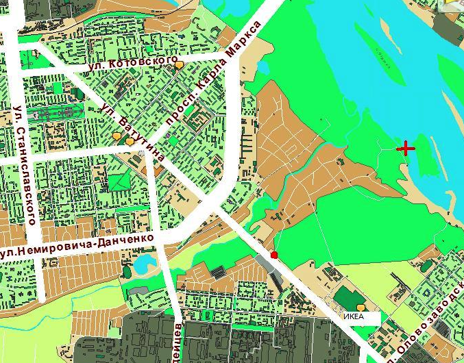 Красная точка – въезд с Ватутина на ул. Пригородную, красный плюс – место проведения тест-драйва.