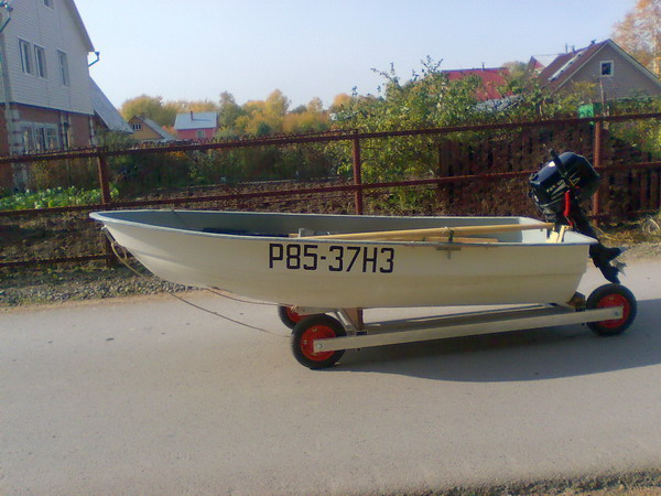 Скрутил для нее телегу - лодка лекго на нее грузится в одного. Потом ставишь мотор и в путь на берег. Пка вода не упала - спокойно вытягивал из воды вместе с мотором, сейчас мотор снимаю, т.к. берег стал круче.