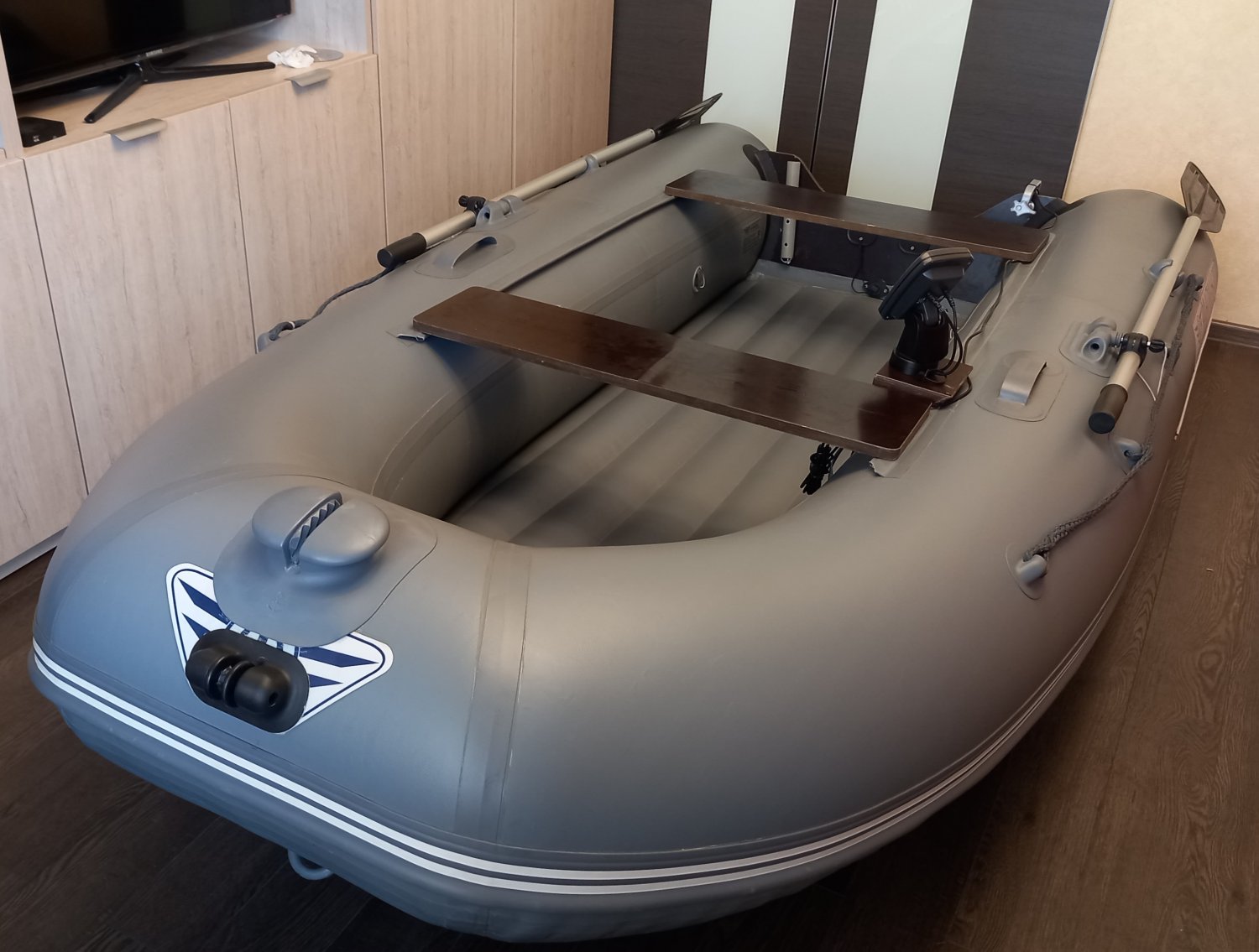 Вместимость 2 человека. Грузоподъёмность 300 кг. MAX мощность двигателя 6 л.с. Три надувных отделения + дно. Транец из влагостойкой фанеры со сливным клапаном. Килеватое дно режет волну. Вес «шкуры» всего 25 кг. Можно вставать на пол в полный рост и рыбачить стоя.
