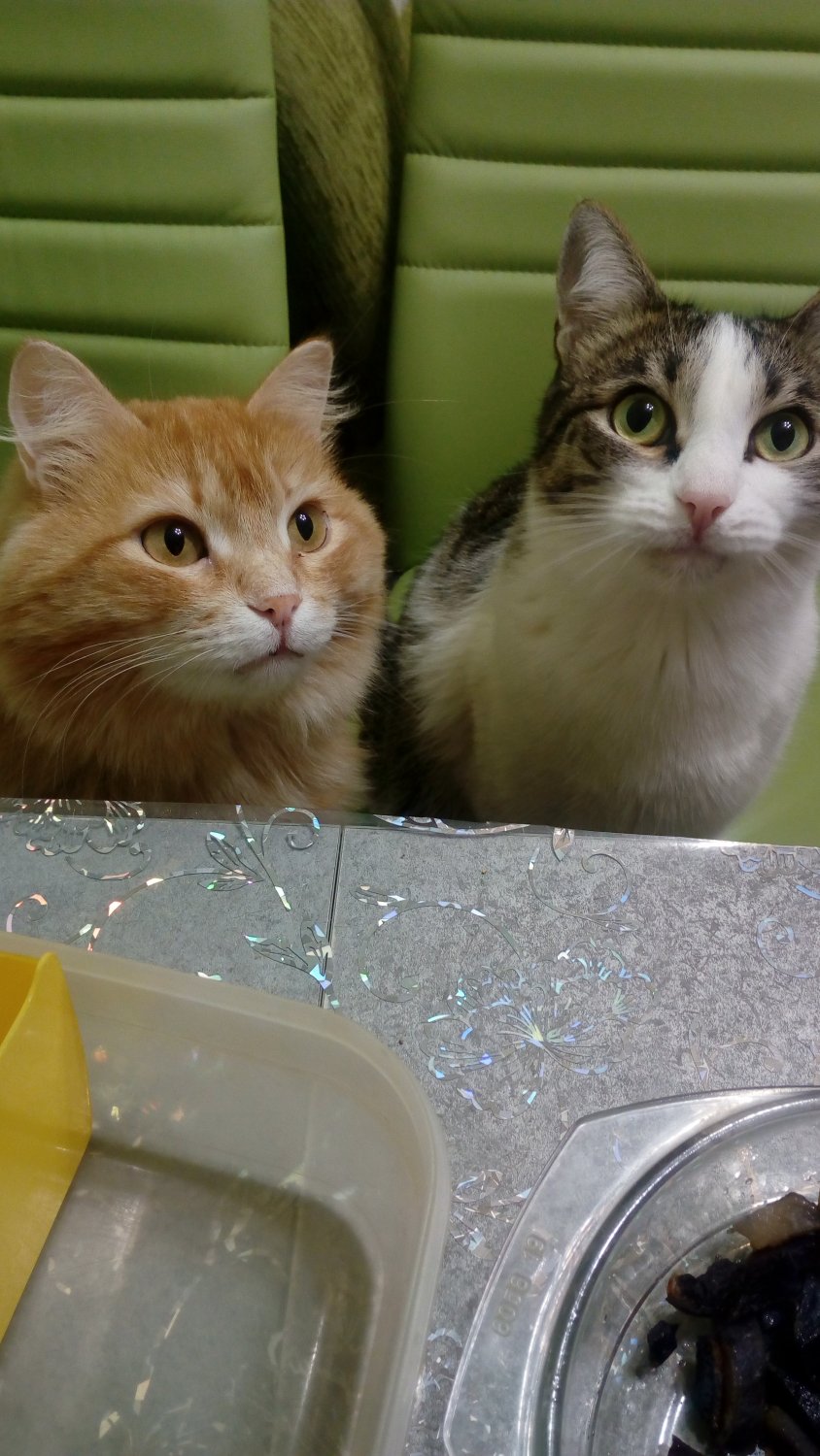 Здравствуйте, не могу мимо пройти, это мои, серый бандит ест только варёную, а рыжий любую, каждый за пять кило :)