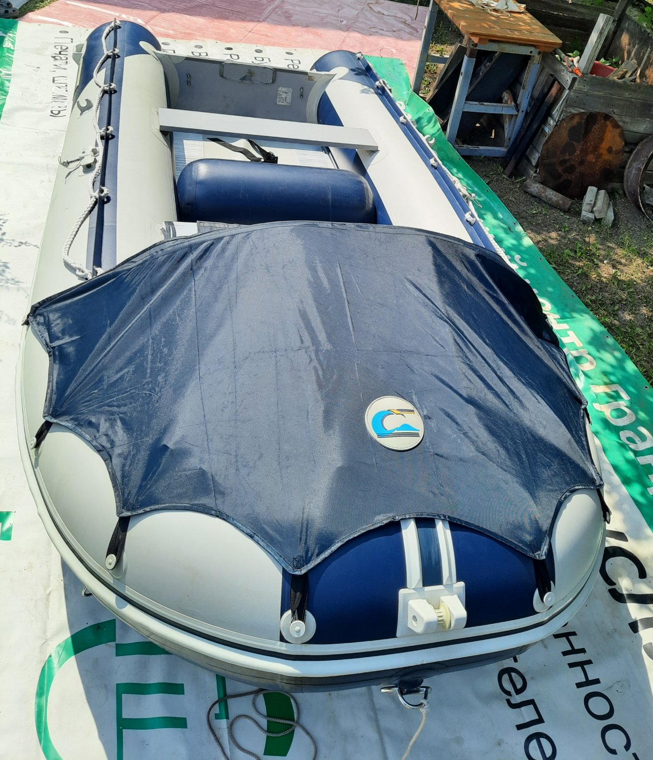 Комплектация лодки: заводские - сигнализатор перегрева и ограничитель перекрута двигателя, две жесткие банки, надувной пуф, сумка навесная на банку, петли для буксировки лыжника или ватрушки, ножной насос, съемный носовой тент на жесткой дуге ПВХ, носовой рым с роликом для поднятия якоря, сливной клапан для слива воды на ходу, ремень для жесткой фиксации бензобака.