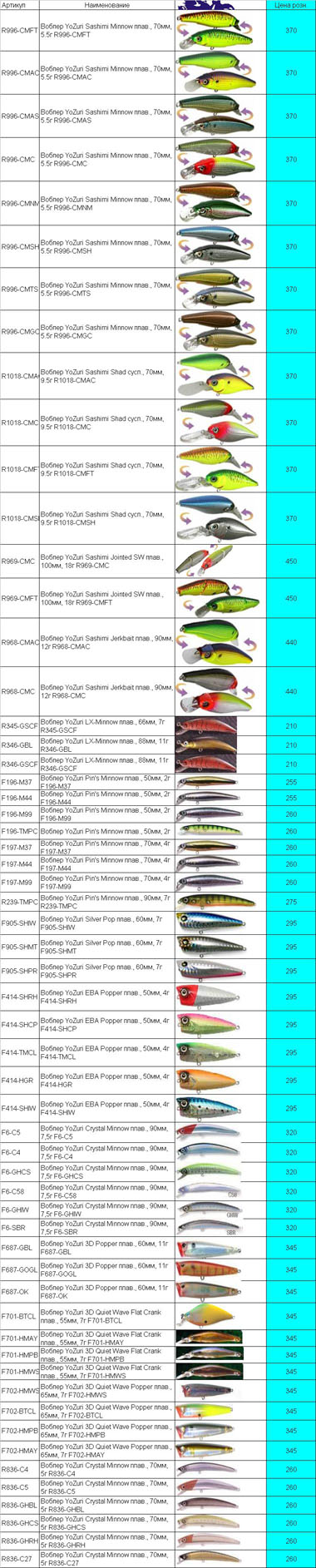 На следующей неделе расширение ассортимента по воблерам Ю-Зури. Цены и картинки ниже:[attachment=0]ю-зури1.jpg