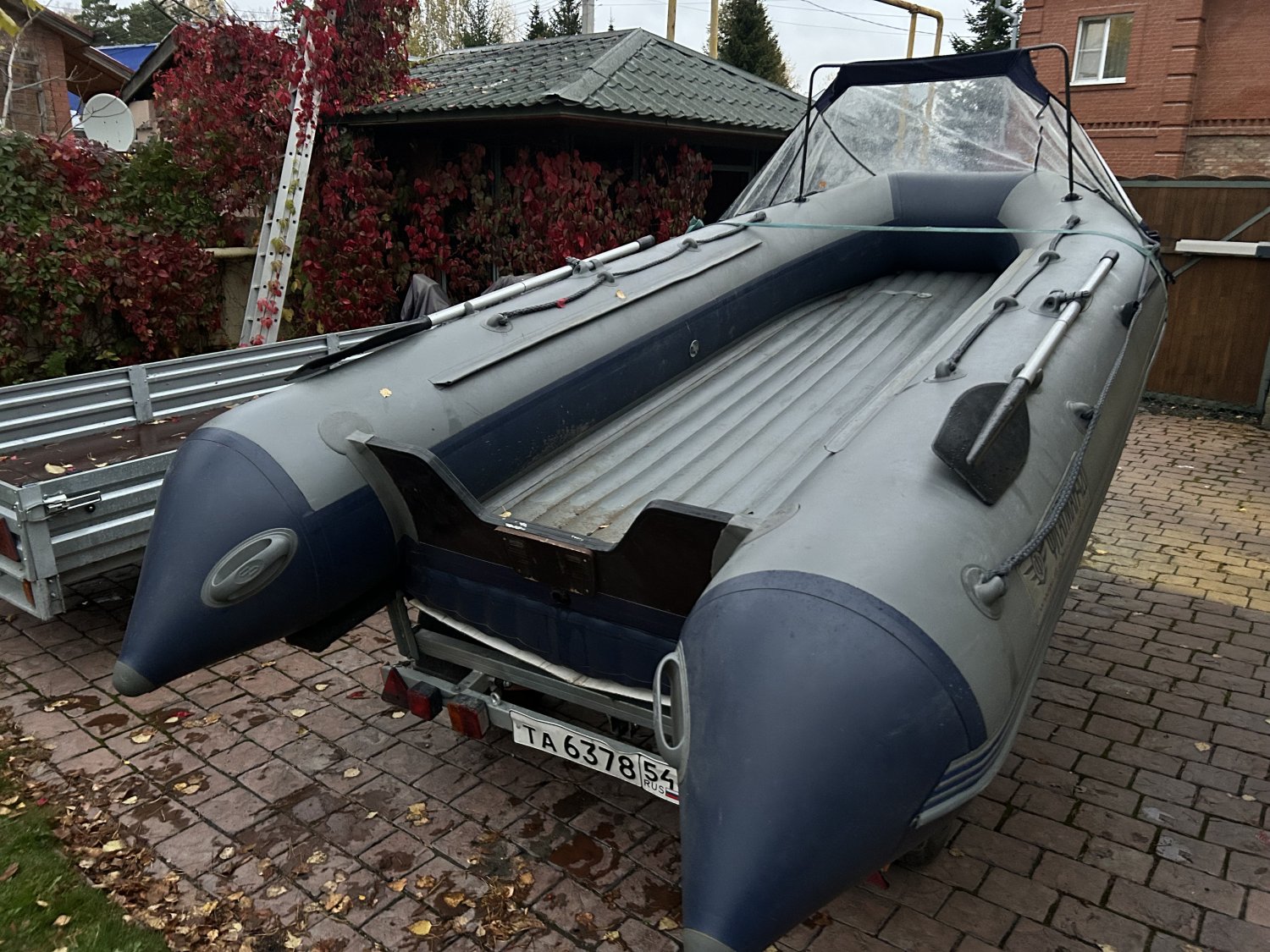 В комплекте: носовой тент, мягкие накладки, спиннинга держатель, два гребных винта, Eva коврик, столик под эхолот.