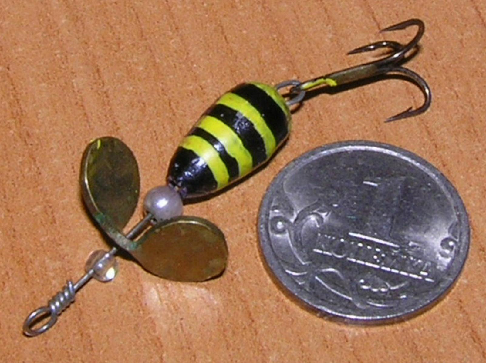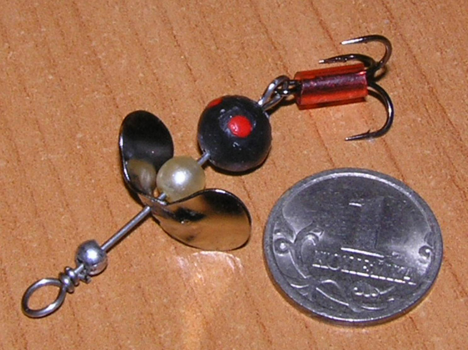 Вес пропеллеров от 2 до 4г. Работают по окуню,язю,краснопёрке,форели. Иногда что нибудь нестандартное садится- плотва,елец; приятель раз карася подцепил.