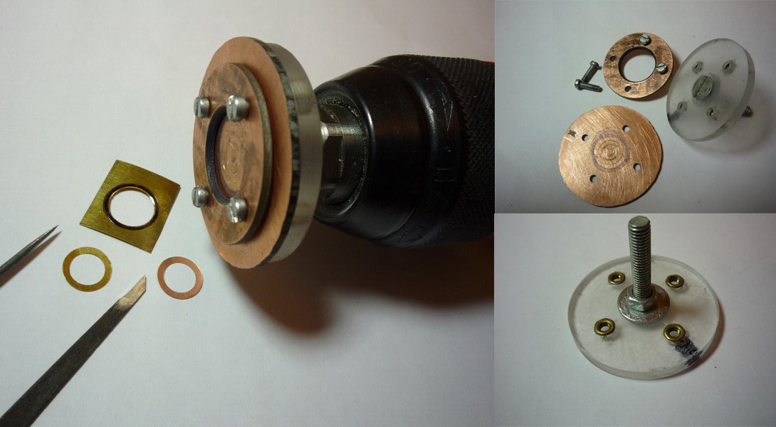 От такой нехитрый девайс позволяет посредством дрели и заточенных надфилей изготавливать на кухонном столе шайбы любых, необходимых для "тюнинга" катушек, типоразмеров.