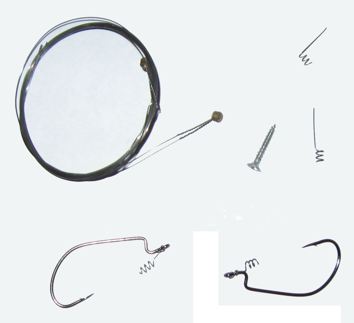 Берем гитарную струну №2 (и что б мы без нее делали), шуруп диаметром 2-3мм и офсетный крючок. Обычно использую номера 2-3.