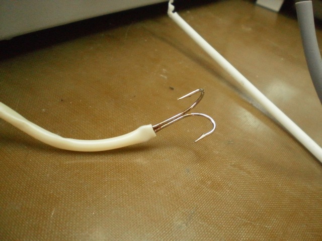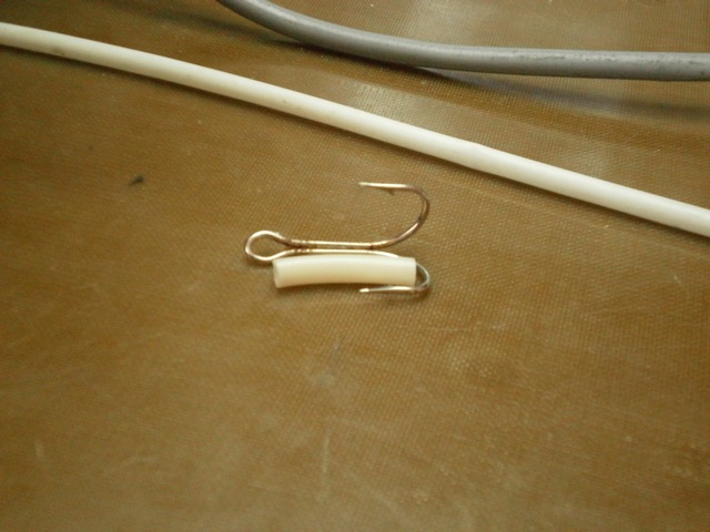 к ушку тройника привязал тоненькую металическую проволочку на втором конце связал петельку таким образом что бы она выступала на 2-3мм ниже тройника на фото видно, ВАЖНО! как показала практика, скрутка этой петельки должна закручиваться дальше к уху тройника, чем у меня на фото, конец скрутки петельки, как на фото, загнут навстречу жалам, это нужно для того что бы цилиндрик после надевания не съезжал с тройника,заранее акуратно протыкаем цилиндрик шилом и одеваем его на тройник.