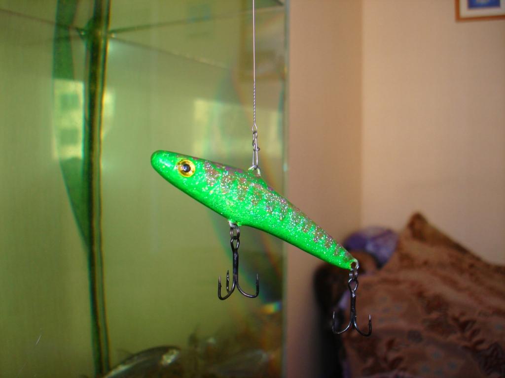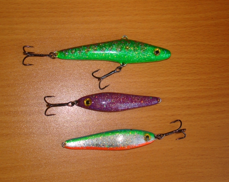 Сделал вчера пару новых расцветок -обьемные блесна и горизонтальный один-балансиром или чем его назвать не знаю-пусть будет горизонтальная обьемная блесна-длинна 90мм ,вес 21,6 грамм.Блесны 10 и 12 гр и длинна 6,5 и 7 см.Расцветки взял с воблеров две и одну на попробовать.