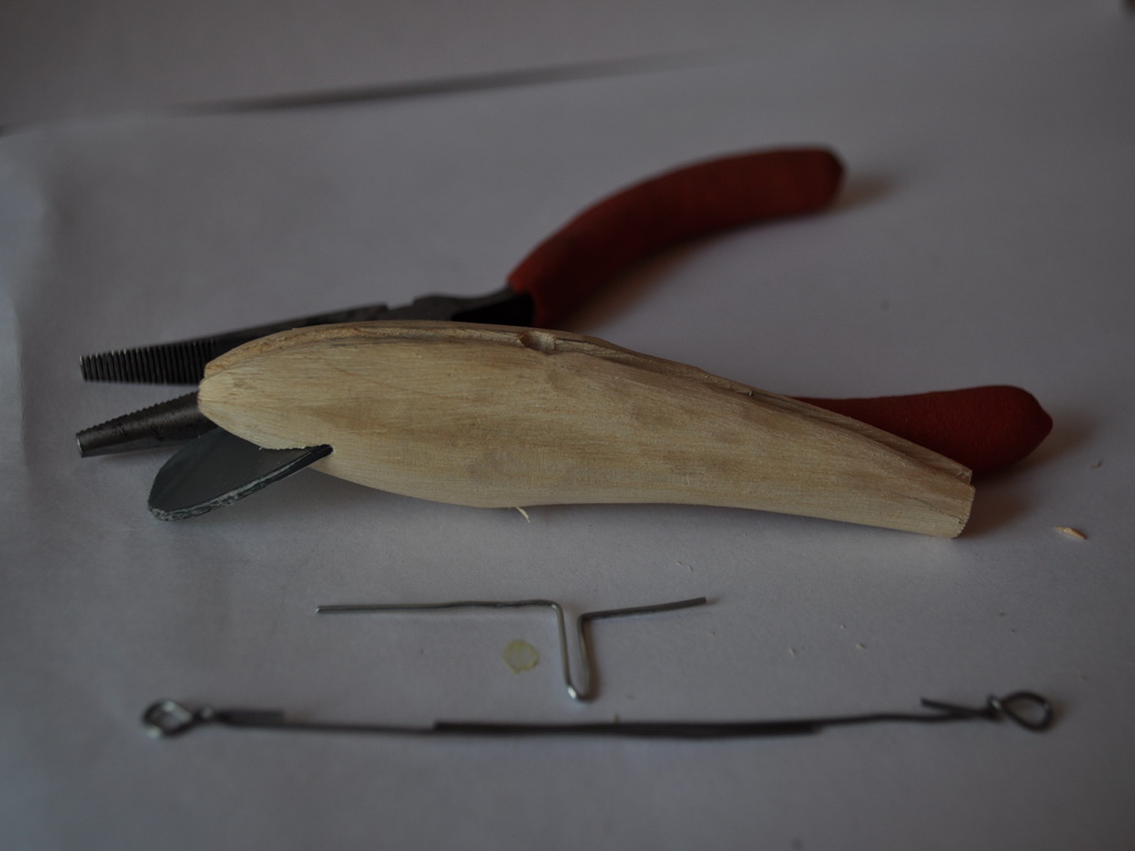 Проволоки под рукой небыло-взял три скрепки.Я пока не вклеиваю ничего-жду ещё ошибок.А потом эпоксидкой заклею.Потом надо чем-то пропитать дерево.А чем? Потом на испытания в ванну.Потом доработка-и покраска.Чем красить тоже не знаю.Может нитрой какой-нибудь?Или лучше на уайт-спирите чё-нибудь?