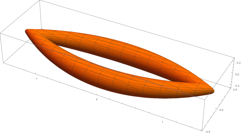 Тут просто визуализация построения, средствами той же Wolfram Mathematica для лодочки 3м длиной, с приподнятым на 10см носом и диаметром борта 30см, причем бортовая дуга кусок тора несколько наклоненного от горизонтали, точка пересечения осевой окружности тора и осевой прямой носового цилиндра находятся на 136см от плоскости сечения миделя, поднята вверх на 10 см, и сужение на 30см, от этой печки и строились все расчеты, где будет центр тора, какой у него большой радиус, и прочие параметры. Сырой исходник лежит тут