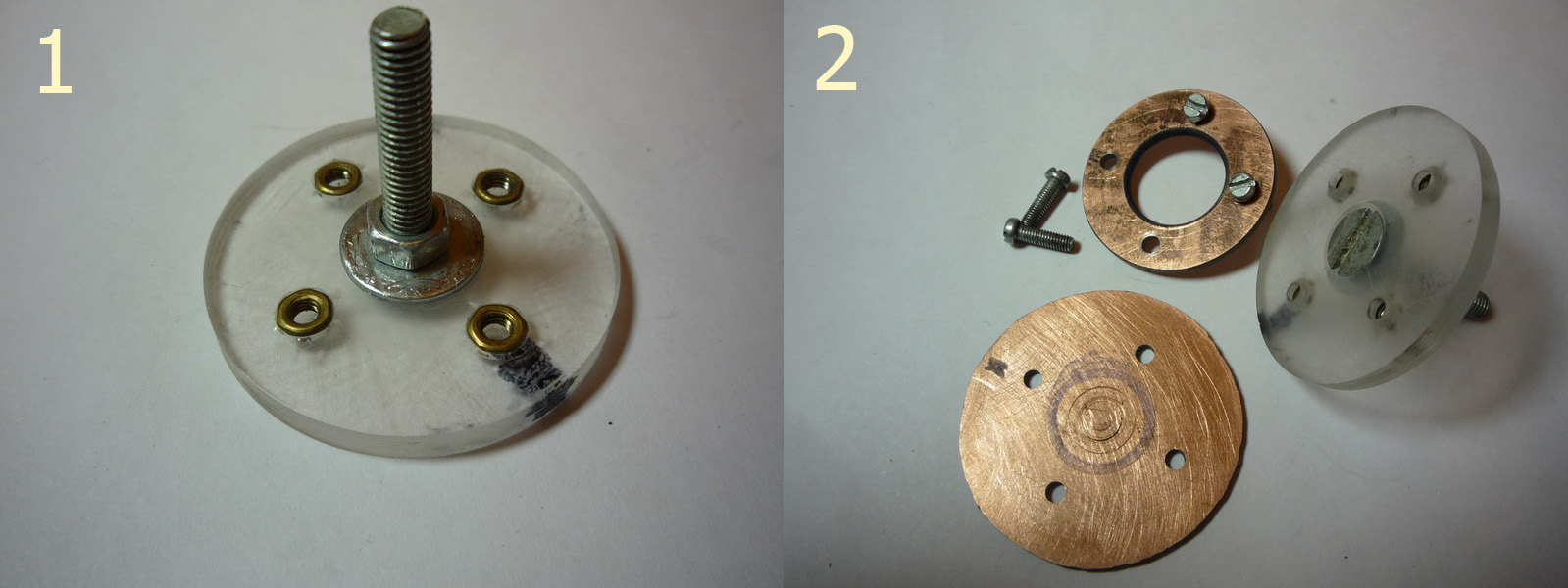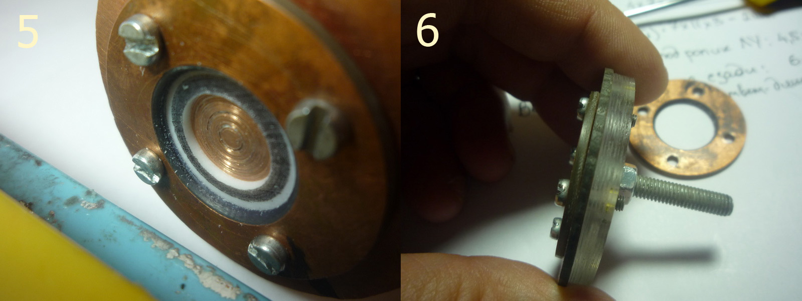 На рис. 5 Приспособление в работе, зажато в дрели и уже резцом вырезан внутренний диаметр будущей шайбы, а также надрезан будущий наружный диаметр. Рис 6 - собранный пакет. Так как на этой фотке заготовка из тонкой фольги, зазора между прижимным кольцом и опорным диском практически не видно.
