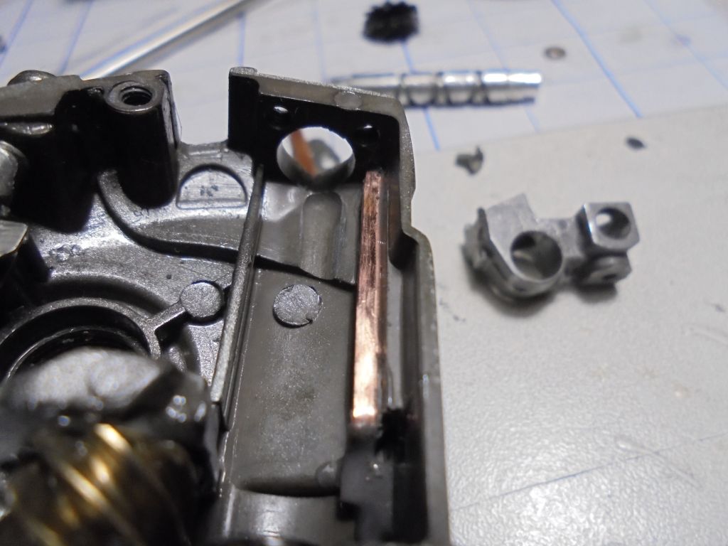 Но нарощенной толщины не хватило, пришлось применить художественную гибку и добавить толщины упору каретки. На фото стадия сырой примерки, позже всё было более точно обжато по месту. Варианта выпасть у коронки нет, ей не позволяет геометрия, плюс она всё-таки проклеена для очистки совести.