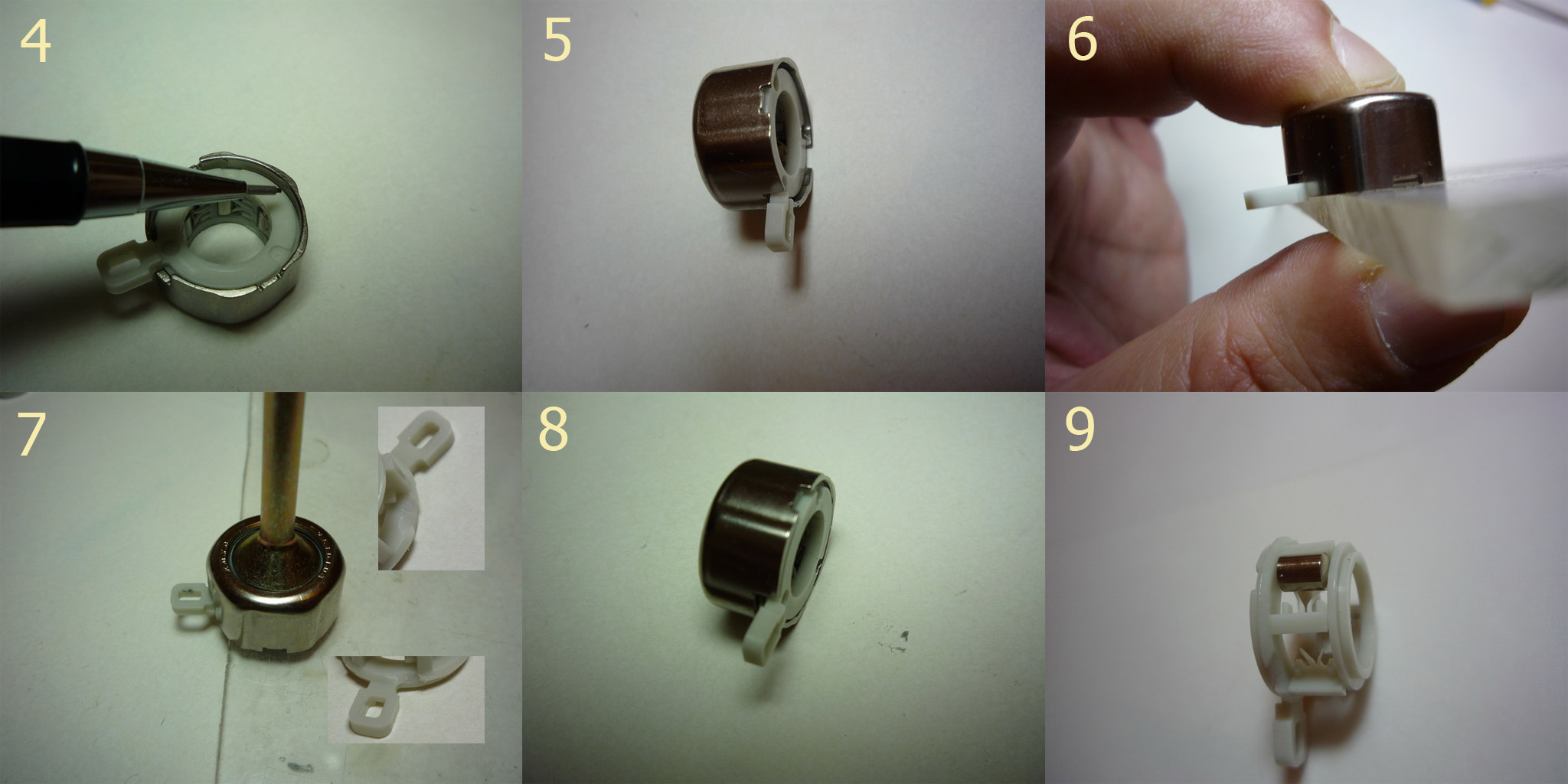 Второй способ борьбы с просевшими или изношенными пружинками, который на какое-то время вновь поднимет усилия поджатия роликов - создать предварительное дополнительное смещение сепаратора относительно наружной обоймы, несколько развернув наружную обойму относительно корпуса катушки путем небольшой доработки "ушастой" фиксирующей шайбы, показанной на фото 20.