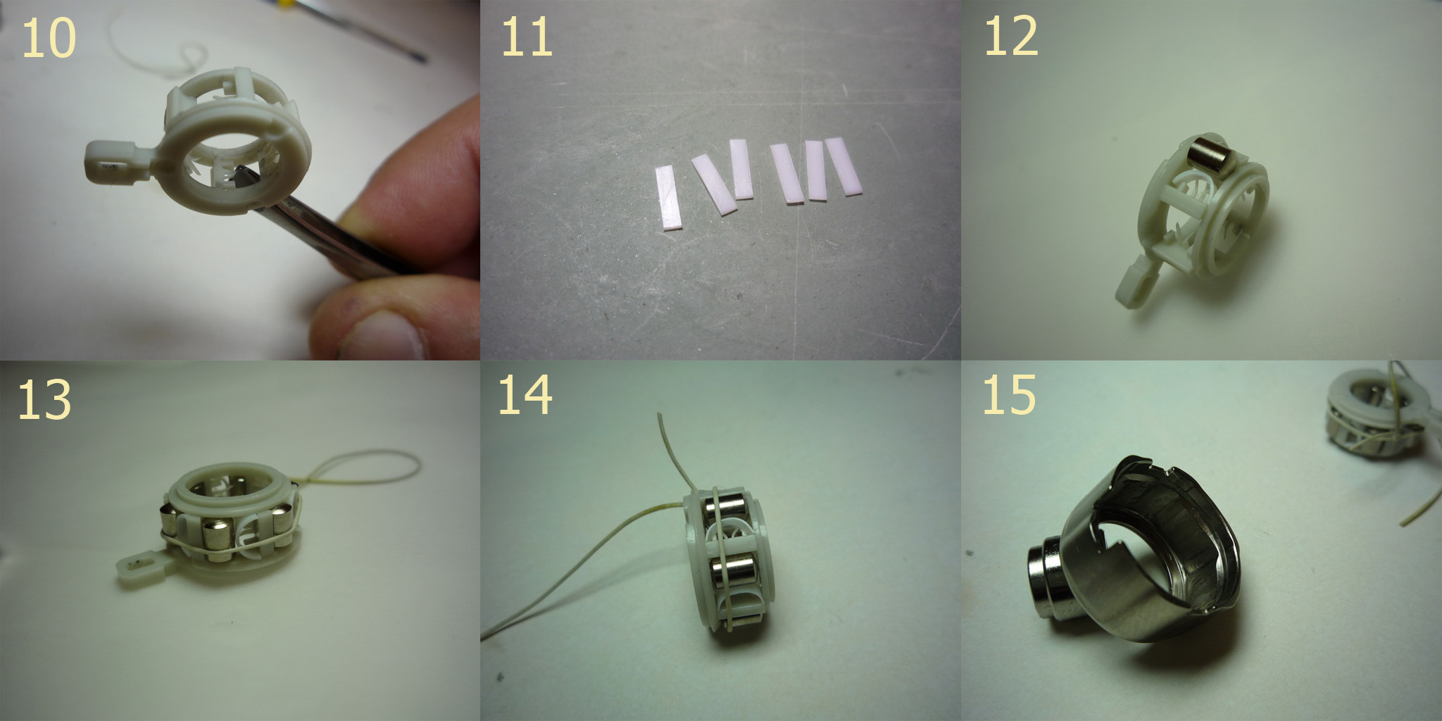 Один из способов временно поднять просевшее усилие поджатия роликов показан на фото 10. Возможно "усики" при сжатии пинцетом целесообразно еще немного подогреть горячим потоком воздуха (например феном). Сам я так не делал - это предположение. Мне хотелось просто продублировать штатные "усики" дополнительной пружиной. В результате экспериментов с разными формами родился работоспособный вариант - пружинки из полоски листового фторопласта (фото 11) в виде дуг, показанных на фото 12 и 13. Жесткость такой пружинки управляется выбором толщины листа, из которого она изготавливается и длиной пластинки, из которой формируем дугу. Первоначально пружинки (на фото 13) получились излишне жесткие. Это сразу чувствуется (после сборки муфты, установки ее на место) простым верчением катушки (без ротора) - катушка крутится ощутимо туже и громче. Вторая итерация (использование более тонкого листа), представленная на фото 14 оказалась более чем удачная.