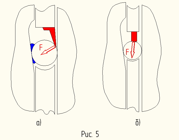 На рис.4 муфта также во включенном положении, и направление вращения внутренней обоймы меняется на противоположное (против часовой стрелки). В этот момент ролик под действием пружины (на рис.а) еще и под действием силы тяжести, а на рис.б) за вычетом ее) зажимается в клиновой зазор до того момента, пока пружина не продавит смазку в точках контакта ролика с обоймами. после этого за счет сил трения внутренняя обойма "подхватит" ролик и совсем немного прокатит его дальше в зазор, где он заклинит между обоймами, исключив дальнейшее вращение внутренней обоймы. Наличие смазки в этом положении и направлении вращения скорее вредный фактор.