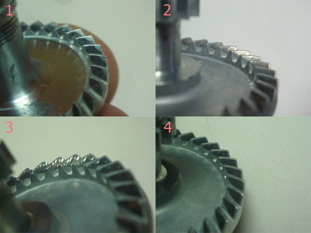 Дополнительно сообщаю, что пятно контакта (след износа) ведущей шестерни с червяком расположено в середине ширины зуба(ъев) ведущей, что может свидетельствовать о более правильном расчете и выполнении эвольвенты зубъев, нежели у Дайв этого класса. Дайву не умаляю, но сколько видел (топовых не смотрел) - у них снос пятна на край зуба по ширине (в радиальном направлении). На фото ниже: 1 - Ultegra, 2-4 разные Team Daiwa со своим "