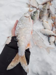 В общем, количество не шибко, но размер порадовал. 11 шт потянули 5540 гр. Кайфонул при вываживании. Глубина около 2 м подо льдом. Уралка 0.5 гр, леска 0.12.