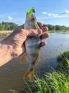 Малая речка, джиг 6 гр, тиога 2.9 дюйма, зелень. Вялая активность, но немного повеселились. Половина поклевок мимо...