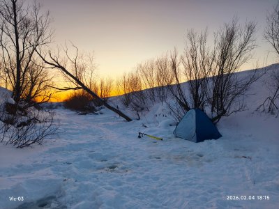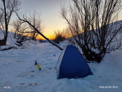Выпал свободный день, поехал в одного на речку. Утром градусник в машине по прибытию на место транслировал минус 29 по Цельсию. Но ветра ноль, потом солнце - в палатке комфортно.