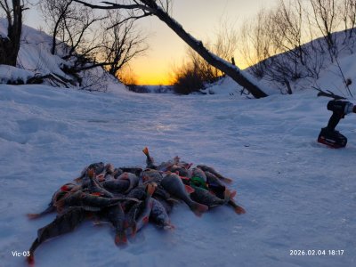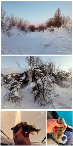 Как оказалось рыбы нет вообще, ни на меляках ни на бровках ни на ямах. Нагулявшись и надышавшись свежим воздухом решаюсь вернуться на старую лунку, а время уже 17:00. По приходу обнаружил что рыб присутствует ,солнце уже в закате и я уговариваю ещё 4-х . После поимки двух ершей собрался домой. Как оказалось идти на ветер в мороз то ещё развлечение, пришлось пару раз останавливаться греть нос)).