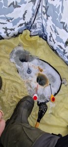 Тактика была проста: не бегать по лункам, а сделать одну и пробовать раскормить. Да и задачи не было наловить мешок — а увидеть хотя бы шевеление кивера, а там уж как повезёт. Глубина в месте ловли была 8–9 м.