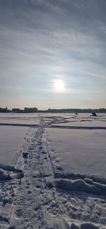 Возле берега рыбы не нашел и кайт серфингисты учатся летать... Шел пешком 2 км примерно в белую пустыню по накатанному следу снегохода. Идти тяжко по целине, без лыж. Иногда водичка под снегом, проваливаешься 30см. Нашел точку ямку первый раз 2 окуня уговорил, второй раз судачок карандаш на мормышку. Трудовая зимняя рыбалка! , когда же лето уже )))