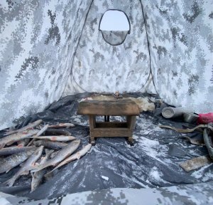 Порыбачил сегодня с товарищем в Колыванском районе. Завершающая рыбалка года две тысячи двадцать пять выдалась морозной. Особенно неприятен ветер, но палатка-автомат спасает)..
