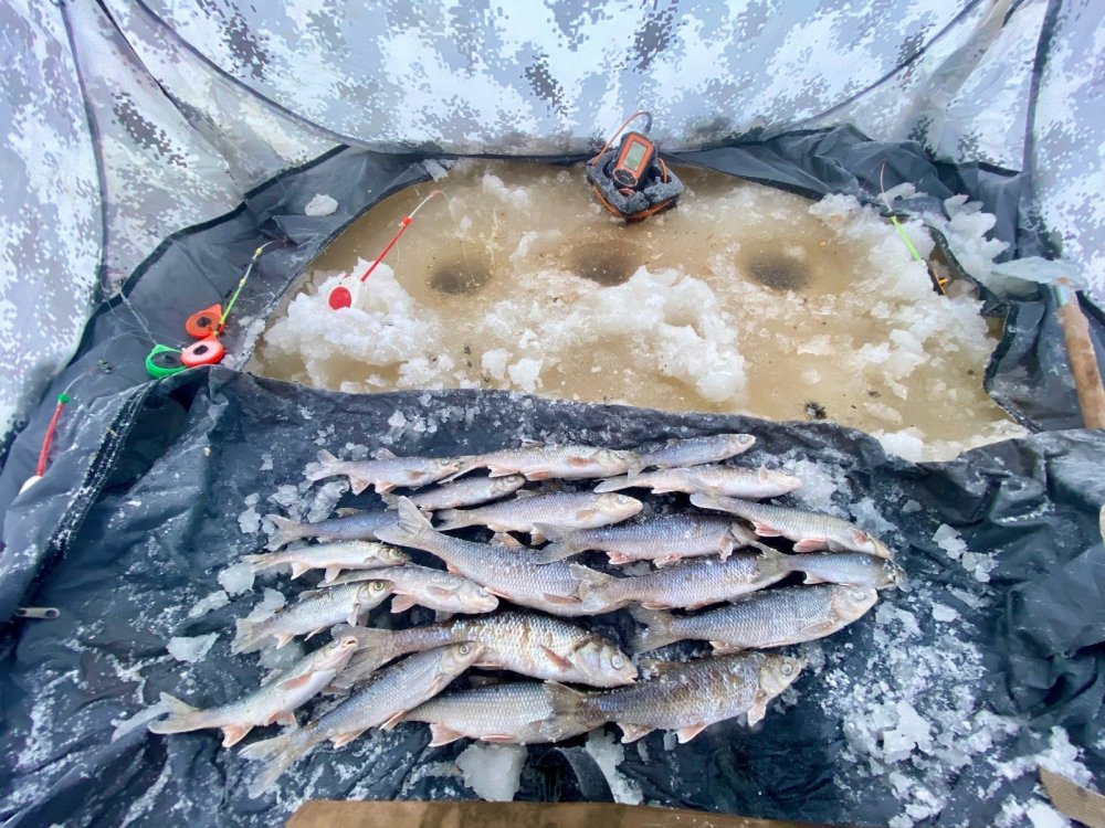 Сам лёд 50-60 см, сырой. Использовали леску 0,08, мормышки салатного окраса в приоритете.
