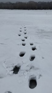 С 8 до 16 всего пару раз находил на 4,5 м стаю окуней, которая тут же исчезала. У берега на 2-2,5м тоже был окунь, но клевать он ни на что не хотел. Решил рвануть в глубь ОВХ, от берега примерно 1-1,5 км, поискать новые перспективные точки, т.к мест там особо не знаю. Около 17-00 нахожу окуня на 3 м без льда, ловлю пару штук и стая растворяется. Начинаются догонялки, с лунки 1-2 либо 0. Уже в седьмом часу остаюсь на одной лунке и до 20-00 ловлю основную массу.