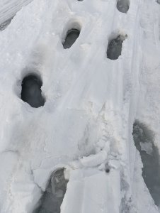 Ледовую обстановку оценю "удовлетворительно". Следы от мототехники держат, идёшь, не валишся. Но чуть в сторону наст конечно местами не держит, есть кое-где вода. Лёд сухой, под метр.