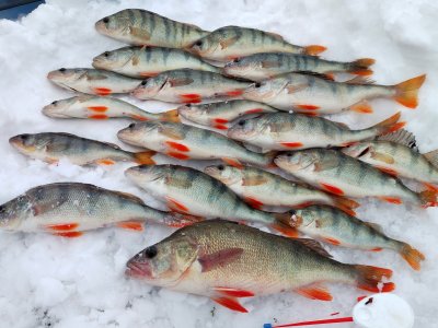 Сначала ходили искали рыбу в ямах, сорогу над лещом, окуня под лещом. Не увенчалось успехом, в ямах стоял один лещ. После ушли на течение, глубины 5,8-6,7. Нашли рыбу, которая постоянно бегала. Но рыба была наша, окунь и сорога. Поймаешь одного с лунки и дальше, а то и не успеешь опустить мормышку. Весело. Потом, товарищ уехал по делам, Я остался, бегал за рыбой. Рядышком сидела толпа, ловила леща. В толпу было совсем не охота, поэтому бегал за нужной рыбой. В какой то момент рыба встала на месте. И начал ловить. Была ошибка, что не поставил палатку. Попалили минут через 30-40. Успел поймать 17 штук. После рыба свалила и когда уже нашел, она заткнулась и не клевала.