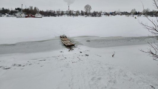 Рыбачил с 10 до 14 , выход на берег проблематичный , разломали вновь прибывшие, вода у крайнего поддона выше сапог , так что завтра - либо ищите еще поддон , либо прыгайте на 1,5 м. Мороза не будет, поддоны не вмерзнут.