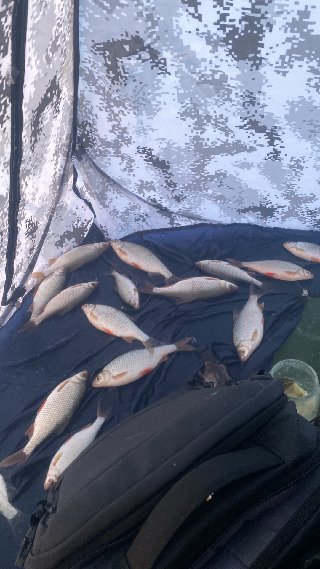 Первым делом, закормил. Глубина не большая. Одел по 1 мотылику и принялся ждать. Поклевки были подходами. А вот самая мелкая поднялась вверх её было видно. Перевязал самую мелкую мармышку, и оторвался как следует, прямо под лункой. Отдохнул отлично и немного половил, уехал в начале 5го вечера... Народ шёл говорит подлец там где поглубже клюёт и щучку вроде ловили, смотрели в камеру судак присутствует но не берет..... Как то так, всем нхнч 👍