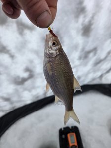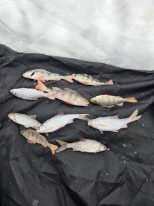 Сначала ходили искали рыбу в ямах, сорогу над лещом, окуня под лещом. Не увенчалось успехом, в ямах стоял один лещ. После ушли на течение, глубины 5,8-6,7. Нашли рыбу, которая постоянно бегала. Но рыба была наша, окунь и сорога. Поймаешь одного с лунки и дальше, а то и не успеешь опустить мормышку. Весело. Потом, товарищ уехал по делам, Я остался, бегал за рыбой. Рядышком сидела толпа, ловила леща. В толпу было совсем не охота, поэтому бегал за нужной рыбой. В какой то момент рыба встала на месте. И начал ловить. Была ошибка, что не поставил палатку. Попалили минут через 30-40. Успел поймать 17 штук. После рыба свалила и когда уже нашел, она заткнулась и не клевала.