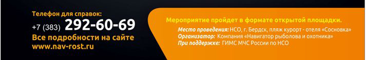 10:00. Начало работы выставки-фестиваля, во время которой ГИМС МЧС по НСО открывает пункт прохождение техосмотра плавсредств. Также на выставке и тест-драйвах водно-моторной техники, рыболовных снастей (спиннинги, катушки, приманки и т.д.) и кемпинга будет представлено: