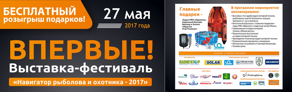 17:30. Начало розыгрыша подарков. Главный подарок: лодка ПВХ «Афалина» от компании «ФишБазар». Для участия в розыгрыше нужно будет приехать, зарегистрироваться на месте и получить купон.