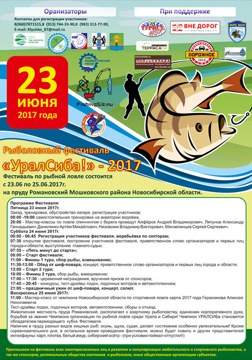 Фестиваль пройдет с 23 по 25 июня 2017 года на водоеме - пруд «Романовский» Мошковского района. Живописная местность пруда «Романовский», располагает к азартному рыболовству, единению корпоративного духа и борьбе за звание Чемпиона организации по рыбной ловле среди Урала и Сибири! Чемпион «Рыболовной битвы УралСиба!» становится обладателем переходящего кубка Фестиваля.