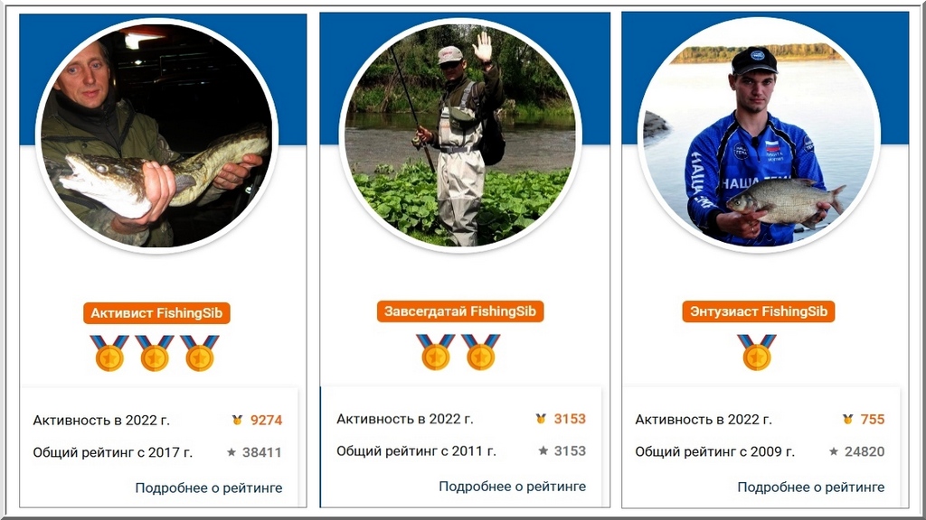 В целом общий рейтинг и рейтинг активности всех пользователей можно посмотреть на странице «Список пользователей сайта Fishingsib.ru». Там можно найти нужного вам автора или отсортировать список по максимальному количеству баллов как по активности, так и по общему рейтингу. А лидеры обоих рейтингов, как и прежде, будут отображаться на главной странице сайта в блоке «Рейтинг» (ранее - «Наши люди»).