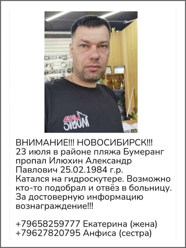 23 июля недалеко от пляжа «Бумеранг» пропал 39-летний Александр Илюхин. Мужчина катался на гидроцикле у Обского водохранилища и упал с него возле берега.