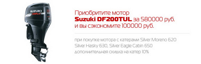 Приобретите мотор SUZUKI DF200TUL за 580000р., и вы сэкономите 100000р. от рекомендованной розницы по России. Так же при покупке мотора с катерами Silver MORENO 620, Silver Hasky 630, Silver Eagle Cabin 650 дополнительная скидка на катер 10%!