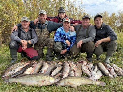 Утро третьего дня. Подъем, умылись и выехали в густейший туман. На прилегающих к корягам песках рыба еще не вышла, и тут мы решаем заехать в коряжник. Делаем постановку, и с первых двух забросов ловим щук примерно 2 и 1кг, я решаю опустить в воду датчик живого сонара и посмотреть, кто там остался еще, и вижу крупный силуэт, стоящий на 1 метре глубины совсем рядом с берегом. Точный заброс 8 дюймовой приманки, медленная равномерка и долгожданная поклёвка крупной рыбы! После подсечки сразу стало понятно, это та, за кем мы сюда ехали! Вываживание около 3 минут и мы эту красотку заводим в подсак! Ура! Взвешивание показывает 11400! Видно, что рыба очень крупная, для меня рекордная, и с ней надо быть осторожным, но юношеская уверенность решает взять щуку голой рукой под жабры… Перчатки ведь остались в Новосибирске… Итог очевиден😬 Вспоротая рука, чуть не посеченное сухожилие и кровища в лодке. Рыбку быстро отпускаем и на базу, оказывать первую помощь, а сразу после принимаем решение идти до Парабели на скоростном катере, зашивать рану. На обратном пути вместе с местным гидом Иваном, одновременно моим хорошим другом, решаем проверить судаковый район, и не прогадали😅 3 шикарных судака с одного бархана за несколько постановок на нем, 4.8, 5 и 5.5кг! Еще не прошла половина дня, а я уже побил два своих рекорда, по щуке и судаку🤭🤭🤭 Вот это круто! Сразу заканчиваем и едем на обед, а на обеде мы узнаем, что мой основной напарник на эту рыбалку, (В ОДИНОЧКУ!) ловит настоящую прабабку, щуку на 13400! Вот это да! Щука после взвешивания была откачана, реанимирована и отпущена. На базе конечно все офигели, молодежь «утерла нос»)) Пообедав и закинувшись обезболами решаем на вечер выйти снова на судачий район с Ваней и Данилой на катере, и снова мне улыбнулась удача! Третий раз за день я бью свой рекорд, второй раз по судаку!) Судак на 6500 дарит незабываемые эмоции от поклёвки и вываживания, конечно мы его отпустили, а он нас напоследок всех троих обрызгал водой😅 Наверное, так он сказал нам спасибо))) А каждый вечер по возвращении на базу нас ждал шикарный ужин, шеф-повар Александр баловал нас разными изысками, но торт из щуки в честь дня рождения постояльца базы это что-то)))