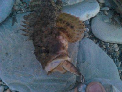 Первым в бой был послан твистер от рыболова , но поласкание его ни к чему не привело . Неприятно удивленные смещаемся под "каракан" пробивая с эхолотом перспективные на наш взгляд места . Встречаем пару лодок стоящих вдоль свала под берегом - они с утра поймали по судачку . одна лодка уходит и мы встаем на их место . Два заброса и у меня садится окунь граммов 30 но точно морской т.к. поклевка была четкая не смотря на 50 граммовый груз.Монстр фотографируется и отправляется за старшими , но почему то зовет не их а такого же наглого и молодого который проглатывает 60 - ый твистер у товарища (прооперирован и отпущен ).