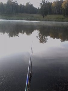 В 4 утра на водоеме, кстати, все съезды с трассы перекопаны бульдозером, но пару тропинок уже накатали. Кто поедет будьте бдительны! На удивление малолюдно и на озере и на речушке . Решено было рыбалить на течении. Супер уловистые снасти по чертежам «Препода» было решено разворачивать в последнюю очередь, т.к. как показала практика, если их первыми зарядить, то на другие времени не будет. Закинул под другой берег два фидерочка, и после этого развернул донки, одну зарядил навозным червяком вторую «каучуко-манкой». Думаю всё… вся рыба моя…