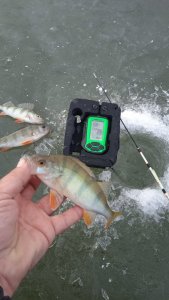Приехали мы с напарником на лёд ещё до рассвета. В потёмках рыба не проявила себя, но на рассвете нет нет, да начал поклевывать окунь. Я рыбачил на балансир и блесну, напарник на якорек и на балансир.