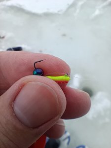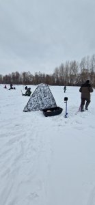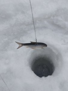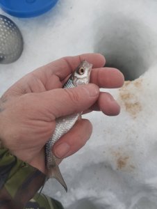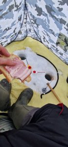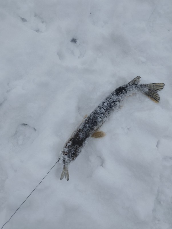 Собрался с мыслями к 14.00 был на инструментальном, пробурил пару лунок, лёд приличный, закормил. Рыба ходит но не активно, говорят клёв с утра был. Поел сало с хлебом, попил чая. Даже покимарил..... Отдохнул на славу и поймал немного подлецов... Уехал в 17.45....