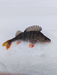 Сегодня утром на горский котлован поехал. Оказалось что лёд не прочный 2-4 см но я место нашел там мель глубина 50 см а лёд там встал на 7 см. Я от берега далеко не отходил на 12 метров отошёл и всё! Сначала на мормышку не клюёт. На вертикальные тоже. Ну я уже разочаровался. Ну как одел балансир сразу пошли слабые подёргивания. Сначало окунь на 80 грамм а потом судачёк на 200гр. И всё.